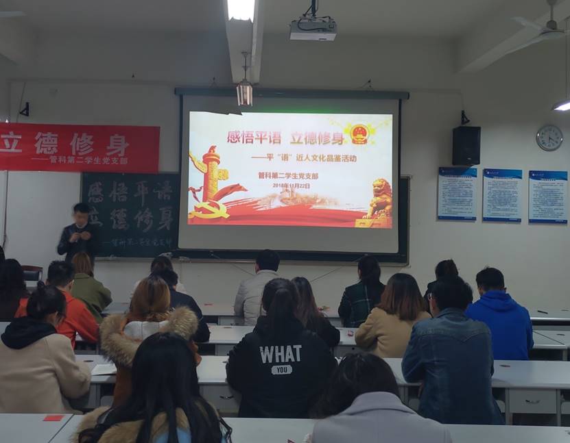 为了让大学生更好地将传统文化的华章佳句和新时代思想联系起来,重温习近平总书记重要讲话,强化学生党员们的政治意识,经管学院管科第二学生党支部于2018年11月22日下午在教5-506举办了《感悟平语 立德修身——平“语”...