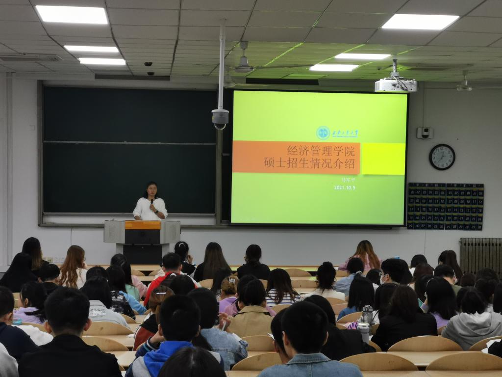 10月5日中午,经管学院2022年研究生招生宣讲会在教1-101举行。管理科学与工程学科负责人马军平教授、研究生秘书、有考研意向的200余名本科生参加了此次会议,会议由马军平宣讲。
