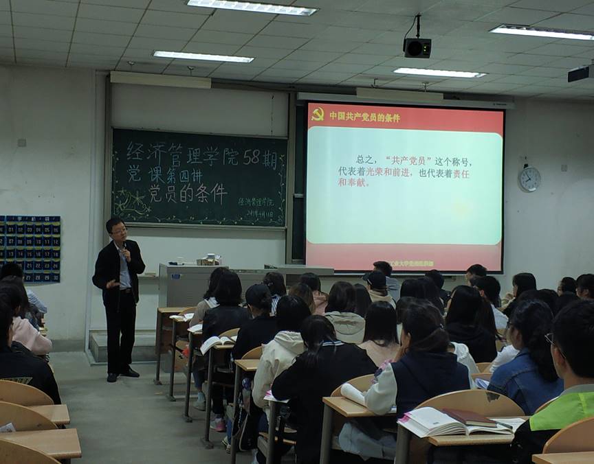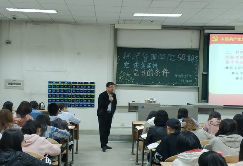 本次党课的主题为“党员的条件”。姜老师以问题“大家有没有写入党申请书?”开头引入了本次的主题。姜老师讲解了党组织对中国共产党员的总要求,其中包括“控制总量、优化结构、提高质量、发挥作用。”让同学们心中明白党组织对党员发展的要求,激励同学们以更严格的标准要求自己。姜老师讲述了入党的四个要求:1、年龄和成分的要求2、政治思想的要求3、组织纪律的要求4、缴纳党费的要求。通过姜老师细致的讲解,同学们清楚理解了身为学生党员应该履行的义务。随后,姜老师向同学们讲解了我国社会主义初级阶段的基本路线,党的十条基本经验,以及共产党员要坚持做到“两个务必”弘扬艰苦奋斗作风。通过本次的授课,同学们认识到应该以高度的责任感,强烈的使命感来做优秀的共产主义接班人,为党组织的壮大添砖加瓦。