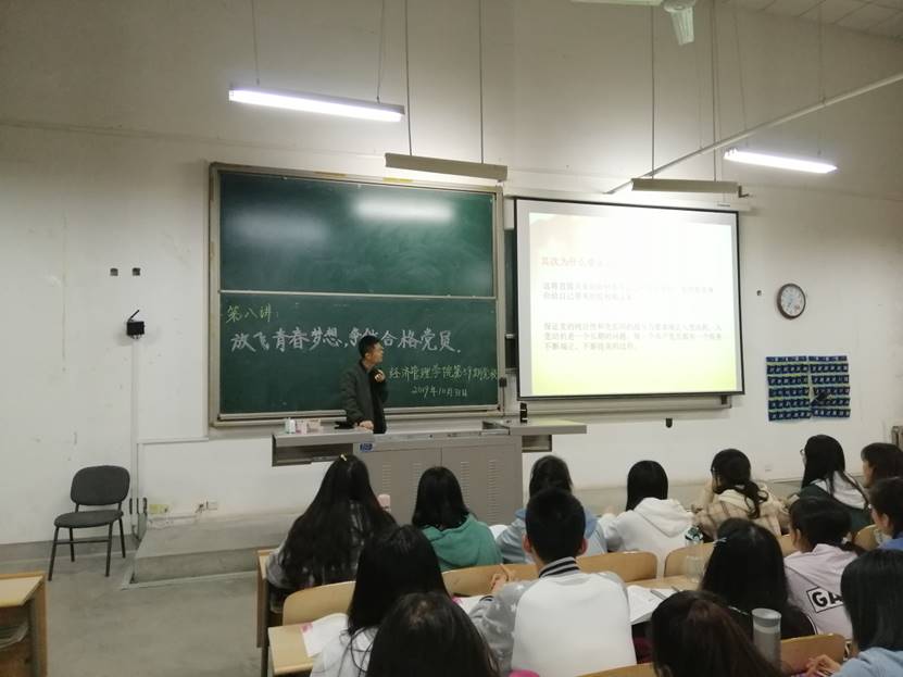 2019年10月31日晚7时,BB贝博艾弗森官方网站第59期党校于教3-217教室进行了党课第八讲理论授课,为了进一步加深入党积极分子对党的理解和认识,提升党校学员的思想高度,本节党课由党委组织部赵伟奇老师为学员们以《放飞青春梦想,争做合格党员》为主题展开授课,党校250余名学员参与。