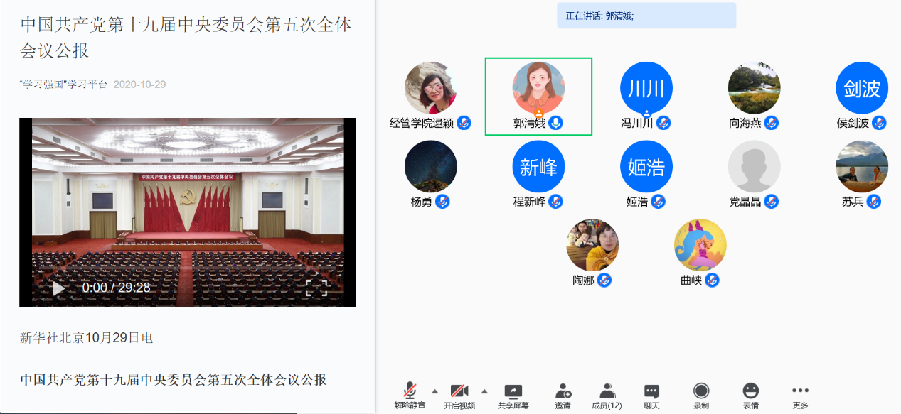 在会上,大家认真学习了《习近平给中国戏曲学院师生的回信》、《习近平出席抗美援朝出国作战70周年大会并发表重要讲话》、《习近平:国家中长期经济社会发展战略若干重大问题》等内容,并着重对《中国共产党第十九届中央委员会第五次全体会议公报》进行了专题学习与讨论。