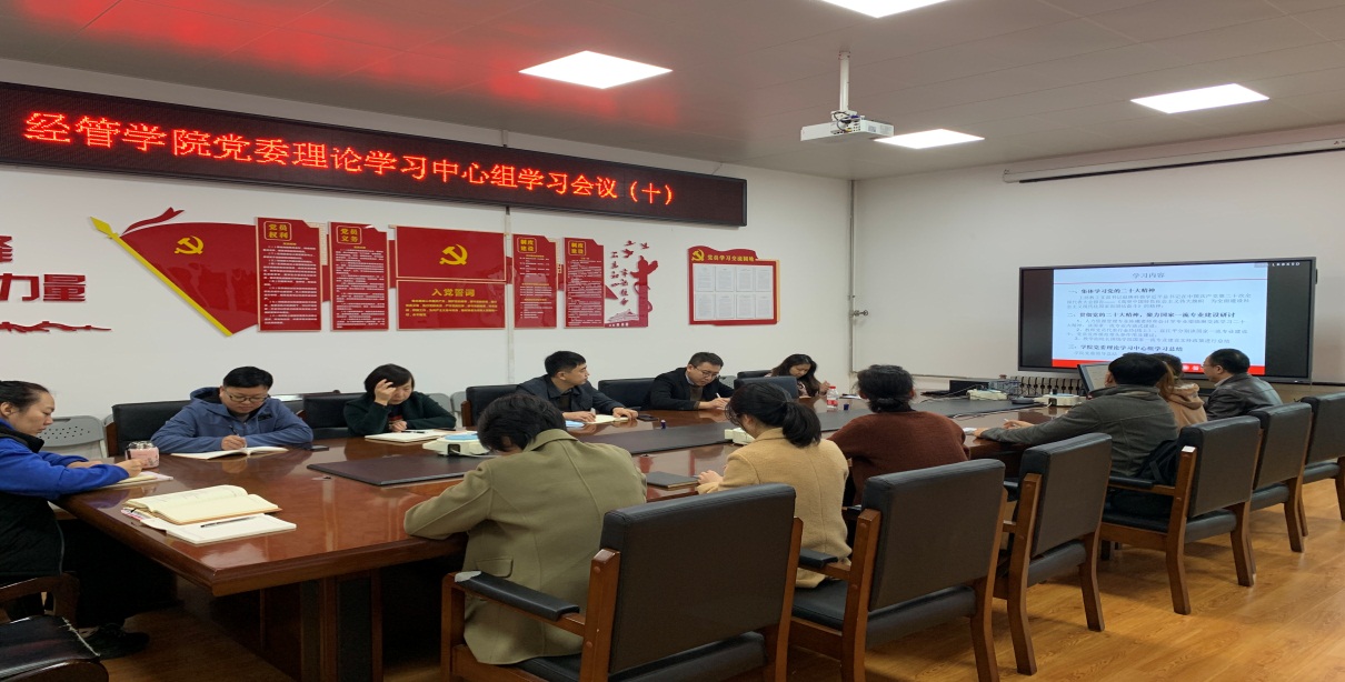 经管学院党委理论学习中心组全体成员、各党支部书记、工商教工党支部全体党员参与学习。