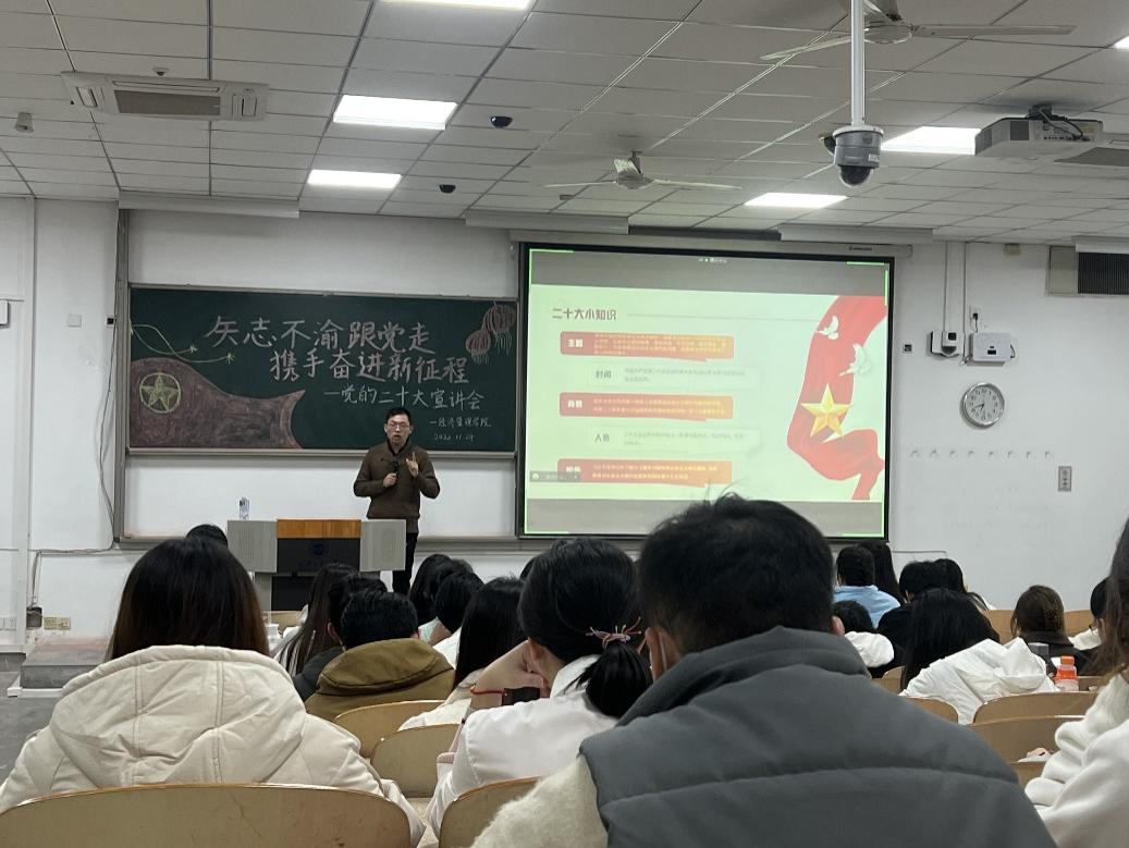 此次宣讲会围绕党的二十大“知多少”“学重点”“谈教育”以及“青年说”四个方面展开。二十大以“高举中国特色社会主义伟大旗帜,全面贯彻新时代中国特色社会主义思想,弘扬伟大建党精神,自信自强、守正创新,踔厉奋发、勇毅前行,为全面建设社会主义现代化国家、全面推进中华民族伟大复兴而团结奋斗”为主题,较为全面的讲述了近五年来国家取得的成就以及经历的经验教训。习近平总书记在二十大报告上提出“三个务必”,即务必谦虚谨慎、艰苦奋斗,务必不忘初心、牢记使命,务必敢于斗争、善于斗争。短短三句话要求了全党同志需坚定历史自信,增强历史主动,为新时代中国特色社会主义谱写更加绚丽的华章。最后,侯剑波寄语同学们:“要坚定不移听党话、跟党走,怀抱梦想又脚踏实地,敢想敢为又善作善成。”