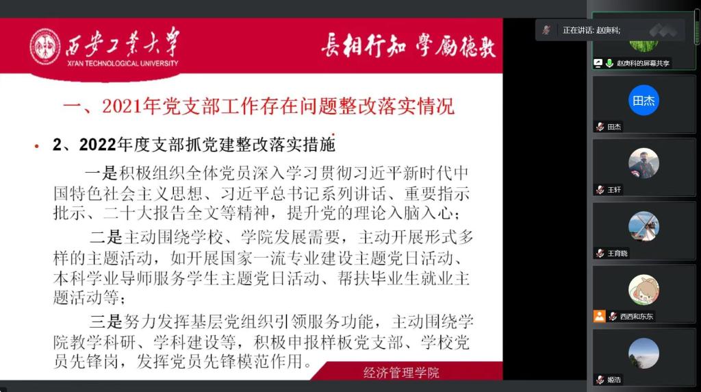 会上,11名党支部书记分别就支部在2021年度党支部存在问题的整改情况、本年度支部工作开展情况、工作存在问题以及今后努力方向四个方面进行了工作汇报。过去的一年中,教工党支部积极配合学院党建工作部署,深化教育引导、强化责任落实,深入学习领会党的二十大精神,不断增强工作的科学性、预见性和创造性。学生党支部围绕开展形式多样的理论学习活动、加强学生党员队伍建设、建设学习型、服务型、创新型支部建设及发挥资源、形成特色等方面进行述职。
