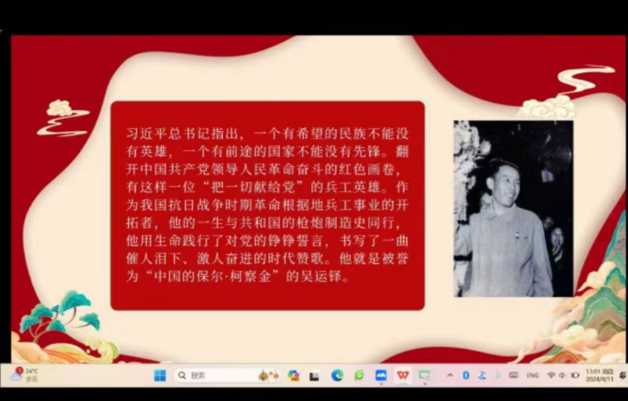 首先,奚姝美介绍了吴运铎的先进事迹。吴运铎是一个在烽火连天的岁月里铸就的英雄,他不仅是一位卓越的炮弹专家,更是一位无畏的无产阶级战士,他的故事是激励我们的精神财富。接着,工商第二党支部党员赵嘉欣详细讲述了吴运铎的故事。在给张海迪的信中,他提到:“只有具有远大理想的人,他的精神才永远是充实的。这理想,就是为人民的幸福、为国家的富强而奋斗、而献身。”吴运铎的一生都是在坚守这份远大而崇高的理想,为了党和人民的事业,他奉献了青春,奉献了生命,奉献了所拥有的一切。