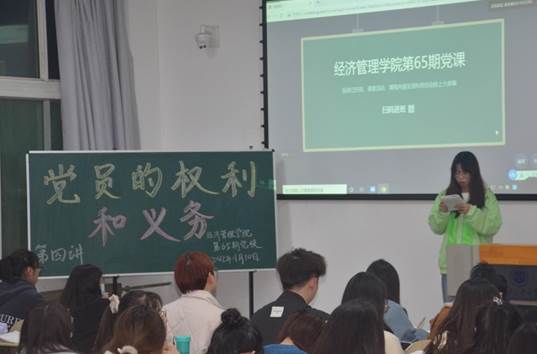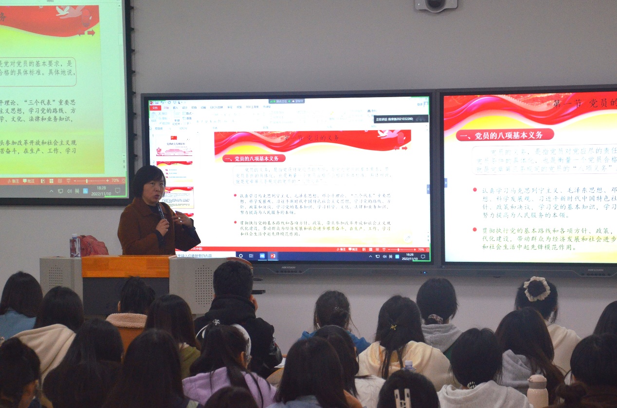 11月10日晚,BB贝博艾弗森官方网站第65期分党校培训第四讲“党员的义务和权利”于教2-102顺利开讲,本次主讲老师为学院党委副书记王育晓,共140余名党课学员参加。