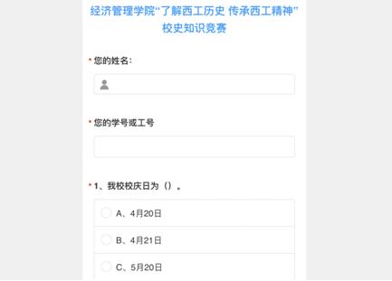 岁月如歌,六十五载栉风沐雨,BB贝博艾弗森官方网站迎来了第65个生日。为了庆祝建校65周年,深化贝博官网广大师生对校史校训校风的认识和理解,4月17日-4月22日,BB贝博艾弗森官方网站举行“云校庆”系列活动之“了解西工历史 传承西工精神”校史知识竞赛,全院师生积极参加了此次活动。