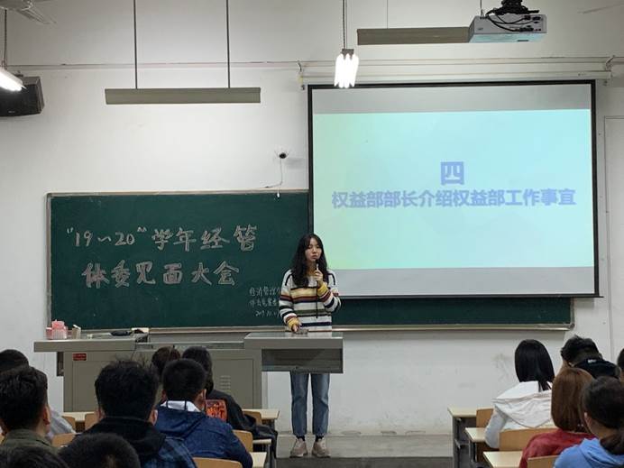 活动伊始,由体育竞赛部部长韩昌东介绍2019-2020第一学年校内及省级运动竞赛计划,用简明的表格来使各体委了解本学年大致工作内容。紧接着,由体育竞赛部副部长张晓玉介绍经管学院竞赛失信系统以及竞赛信息收到干事负责制,通过简单的介绍使大家了解工作流程及重要性。在体育竞赛部部员进行自我介绍后,由权益部部长介绍权益部工作事宜。接着由体育竞赛委员会会长对18-19学年“优秀体委”进行颁奖表彰。最后,体育竞赛委员会会长进行发言总结。