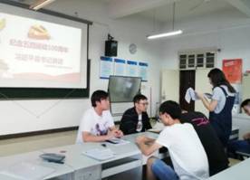 活动伊始,大家进行了“纪念五四运动100周年习近平总书记讲话”的学习。学习过程中,同学们认真观看并详细记录。习近平总书记的讲话使大家斗志昂扬并对此畅谈自己的体会。党员徐靖伟表示:“作为新时代新青年,我们更应承载起历史重担,为了民族复兴的使命而不断奋斗!”预备党员王媛媛表示:“今天发扬五四精神,就要把五四运动倡导的爱国、进步、民主、科学思想同实现中华民族伟大复兴中国梦统一起来,做新时代的追梦人。”最后,王轩老师对此次学习进行了总结,希望同学们传承五四精神,把社会主义核心价值融入到学习和生活中,做一名优秀青年。