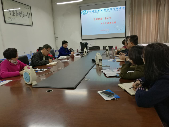 曹书记首先强调了全面贯彻党的十九大精神和中央纪委二次全会精神,压实全面从严治党主体责任和监督责任,充分发挥案件的警示教育和治本作用。然后用具体案例说明高校贪腐情况,要求大家加强理想信念教育,筑牢党员干部不想腐的思想根基,严格落实中央八项规定精神和省委实施意见,持之以恒纠正“四风”,充分认识高校系统依然严峻的反腐败斗争形势,认真落实“无禁区、全覆盖、零容忍”的要求,始终保持惩治腐败的高压态势,坚决整治侵害师生利益的不正之风,严肃查处“微腐败”问题。曹书记说作为高级知识分子,我们要从自身做起,从我们的日常工作做起,提高我们的学习风气和学术风气,大力开展师德师风主题教育活动,逐步形成师德师风建设长效机制。