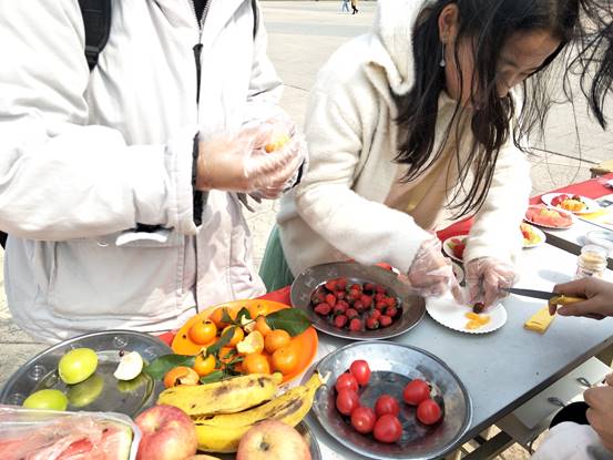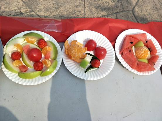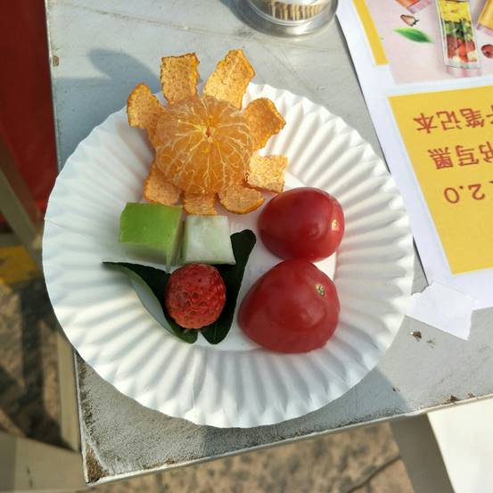 本次现场活动包含两项。第一项,你是我的幸运色。玫瑰配佳人,每个女孩都渴望收到优雅纯真的玫瑰。今天的幸运色为粉色,所以由四名男生为身着粉色衣服的幸运女生送上带有祝福标语的玫瑰,收到惊喜礼物的幸运女生红着脸,害羞的接过男同学手中的玫瑰,并受邀参与水果DIY制作活动。第二项,“水果甜,你更甜”水果DIY体验活动。同学们积极地用水果表达自己喜悦的心情,每一件作品都富有创意。有用西瓜小块和西瓜籽拼成的笑脸,用苹果切片拼成的小鸟,用橘子果肉和橘子皮拼成的花朵……
