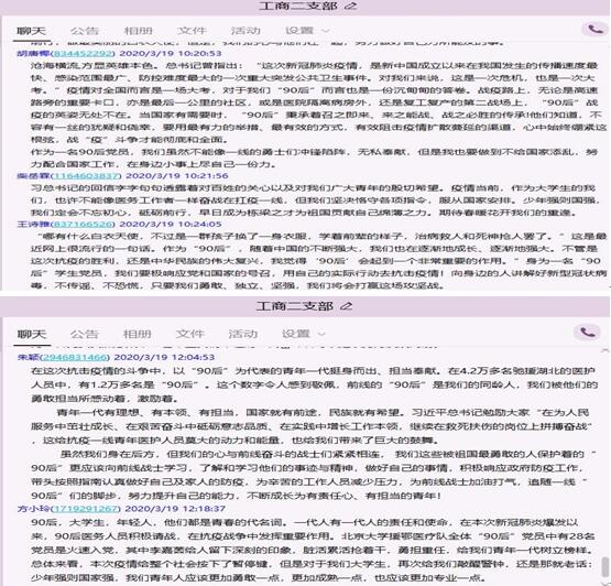 随后支部成员们展开热烈的讨论,苗静怡同志联想到马克思关于青年选择职业的文章感叹奋战在一线的“90后”党员选择为广大人民服务奉献的精神值得我们学习;李卓璟同志说总书记的回信不仅是对“90后”党员的赞扬,更是对我们的一种鞭策,激励我们为疫情防控做力所能及的事情;岳晗晴同志说我们应该时刻牢记总书记的嘱托,锤炼品德修为,练就过硬本领,肩负为社会为人民贡献新时代的青年力量。大家也纷纷表示作为一名“90后”学生党员,虽然在疫情来临时不能像一线的白衣战士们一样冲锋陷阵,但我们的心与前线奋斗的战士们紧密相连,我们要认真学习、深入贯彻总书记回信精神,积极响应党和国家号召,努力奋斗。