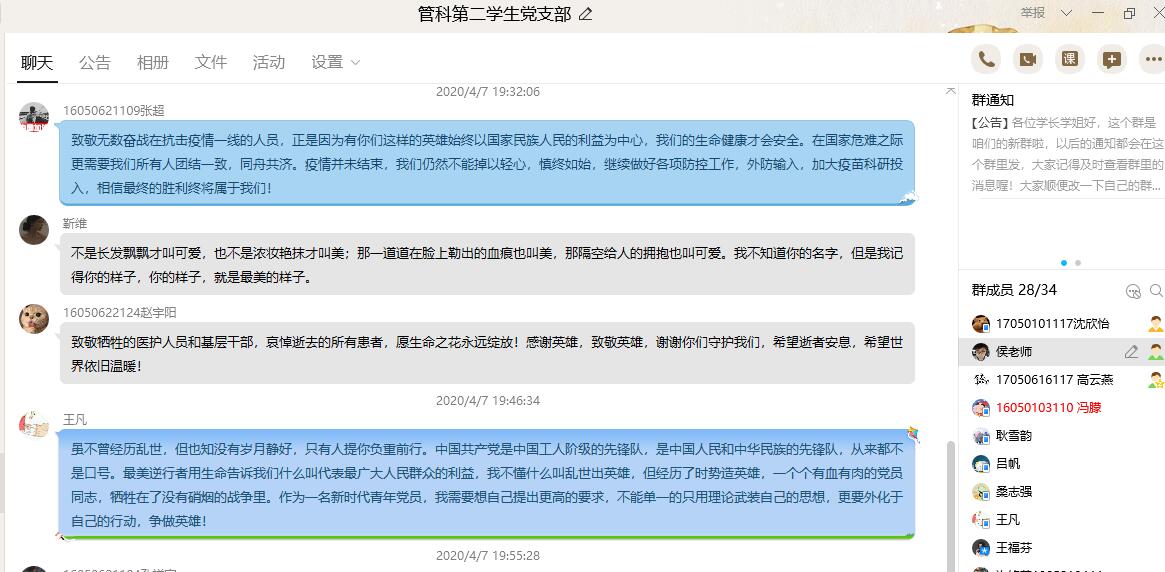 为铭记先烈功绩,哀悼为在抗击新冠肺炎疫情斗争中逝世的同胞,传承和弘扬民族精神,2020年4月7日下午6点,BB贝博艾弗森官方网站管科第二学生党支部依托“腾讯课堂”APP,采用在线活动形式召开了“缅怀革命先烈,云祭时代英雄”主题党日活动。本次活动由党支部书记侯剑波老师主持,31名支部党员参加活动。