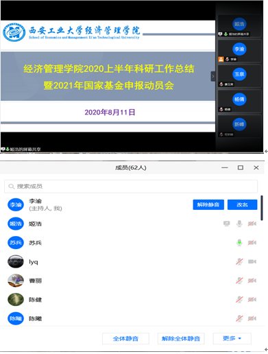 8月11日下午19:00,BB贝博艾弗森官方网站通过腾讯会议组织召开了BB贝博艾弗森官方网站2020上半年科研工作总结暨2021年国家基金申报动员会启动会议。会议由经管学院姬浩副院长主持。经管学院全体院领导、学术委员会成员、团队负责人、学科(学术)带头人(负责人、秘书)、部分教师代表等六十多位老师参加了本次会议。首先,姬浩副院长将学院2020年上半年科研工作进行了总结。接着,姬浩副院长对学院2021年国基金、教育部项目申报工作做了安排,并表示,学院后期将邀请校外专家为贝博官网教师国基金申报书进行评审,学院方面会为老师们提供一切可能的帮助与支持,助力老师们的国基金申报工作。最后,苏兵院长做了2021年国基金项目申报动员讲话并对目前国基金申报形势进行分析总结,鼓励各位老师在假期间合理安排时间,做好2021年国基金申报工作。
