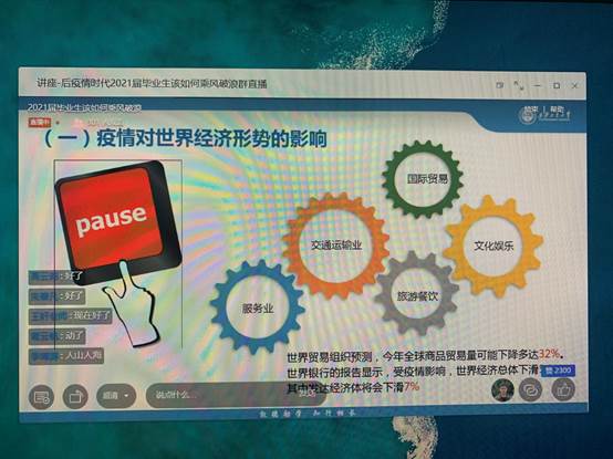 经历了新冠疫情的洗礼,2021届毕业生的就业形势更加严峻。为应对当前不容乐观的就业形势,做好毕业生就业工作,加强对本科生就业的指导与帮助,提升贝博官网本科毕业生的就业意识,确定有效的职业发展目标。2020年10月7日晚上7:00,贝博官网学业辅导中心通过钉钉直播形式成功举办了就业指导讲座。此次就业指导讲座特邀贝博官网就业指导中心付园老师主讲,讲座由王轩老师主持,BB贝博艾弗森官方网站党委副书记程新峰老师、全体学工干部及2021届全体本科毕业生参加了此次讲座。