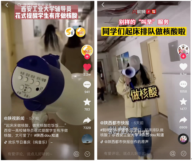 这些花式口号和歌曲都是BB贝博艾弗森官方网站辅导员为引导学生积极排队做核酸而创作的,给平淡枯燥的封校生活增添些许活力。喊楼过程被拍成视频后受到陕西省教育厅、陕视新闻、西安都市快报、陕西政协20余家新闻媒体报道,在微信、抖音、微博、视频号等平台被广泛转载,视频累积转发播放量突破1000万次。