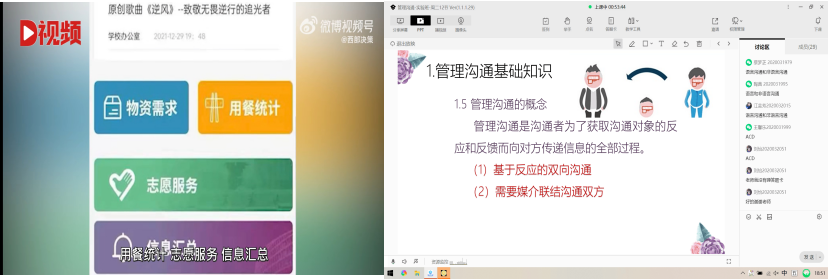 程成老师在《管理沟通》课程中,给学生展示了19名西北工业大学的学生共同开发的疫情防控小程序。小程序包括物资配送、用餐统计、志愿服务、信息汇总、心理咨询等板块,鼓励学生不断创新,运用专业知识为社会做贡献,培养学生的家国情怀与责任担当。