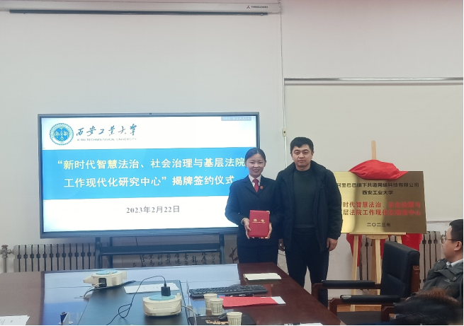 2月22日中午,BB贝博艾弗森官方网站与西安未央区人民法院,西安丝路物联网产业园管理有限公司(倪光南院士专家工作站),阿里巴巴旗下共道网络科技有限公司合作签约,暨新时代智慧法治,社会治理与基层法院工作现代化研究中心揭牌仪式在BB贝博艾弗森官方网站教5-520会议室举行。未央区人民法院未央宫人民法庭庭长郭丽华;共道网络科技有限公司副总裁刘业轮,总监王晨昊;丝路物联网产业园管理有限公司倪光南院士专家工作站发展合作部主任毛真;BB贝博艾弗森官方网站院长苏兵,党委书记姬浩,党委副书记王育晓,副院长焦源出席了揭牌签约仪式。