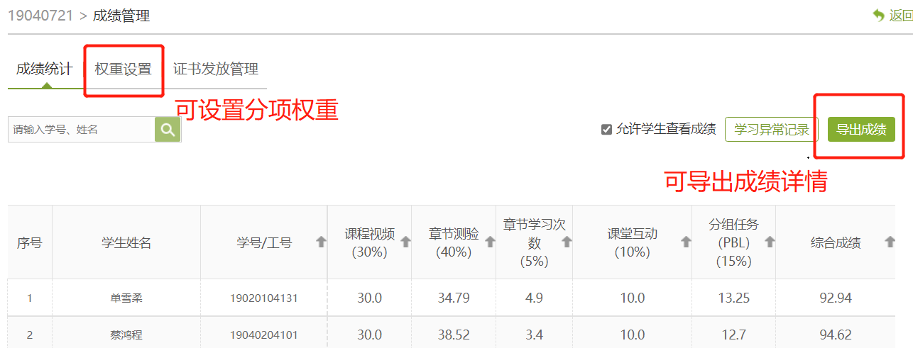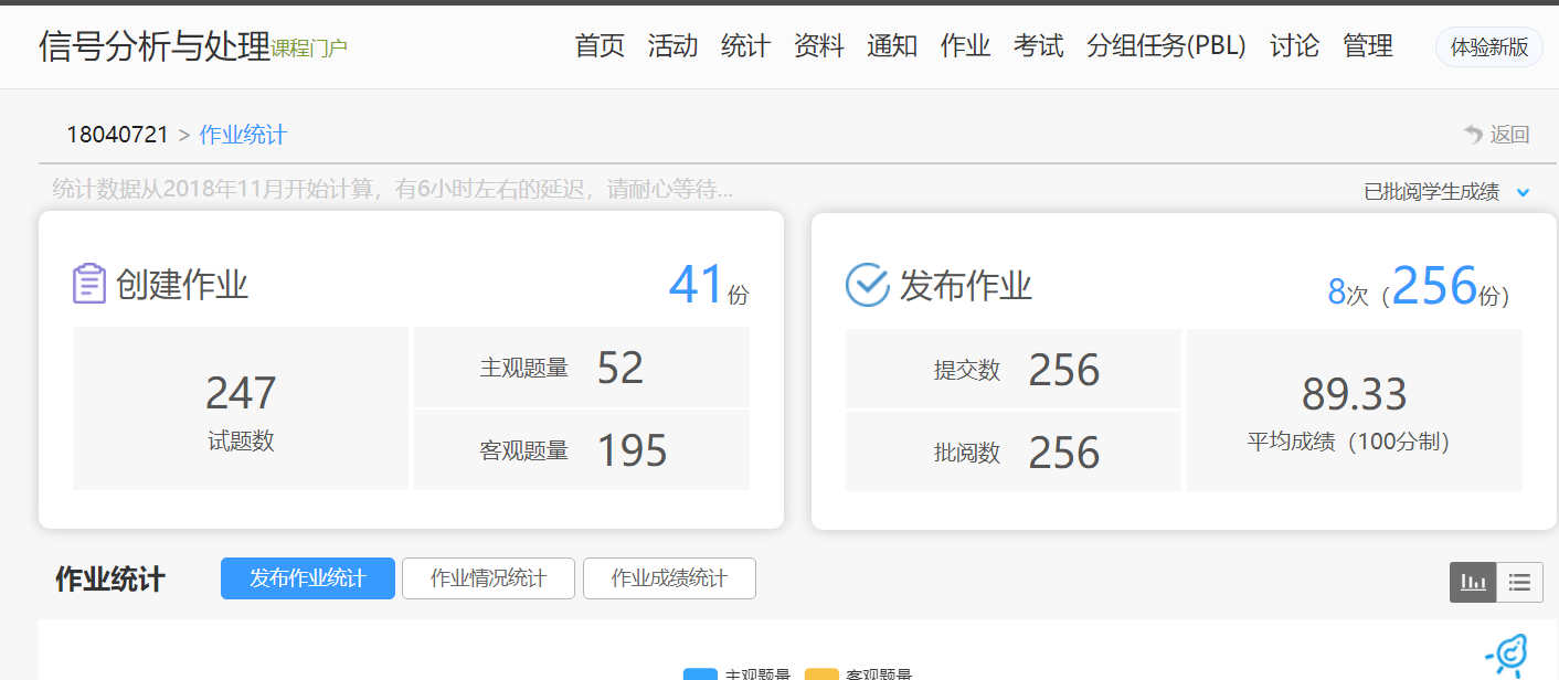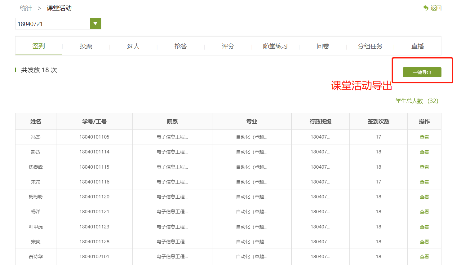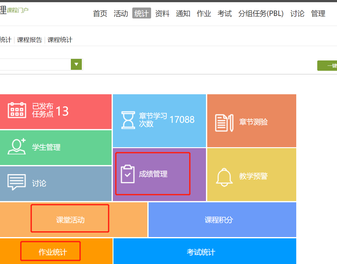 在课程界面,点击进入“统计”界面,分别进入“课堂活动”模块/“作业统计”模块,查看对应统计详情,进入“成绩管理”模块,查看各项活动的成绩详情。