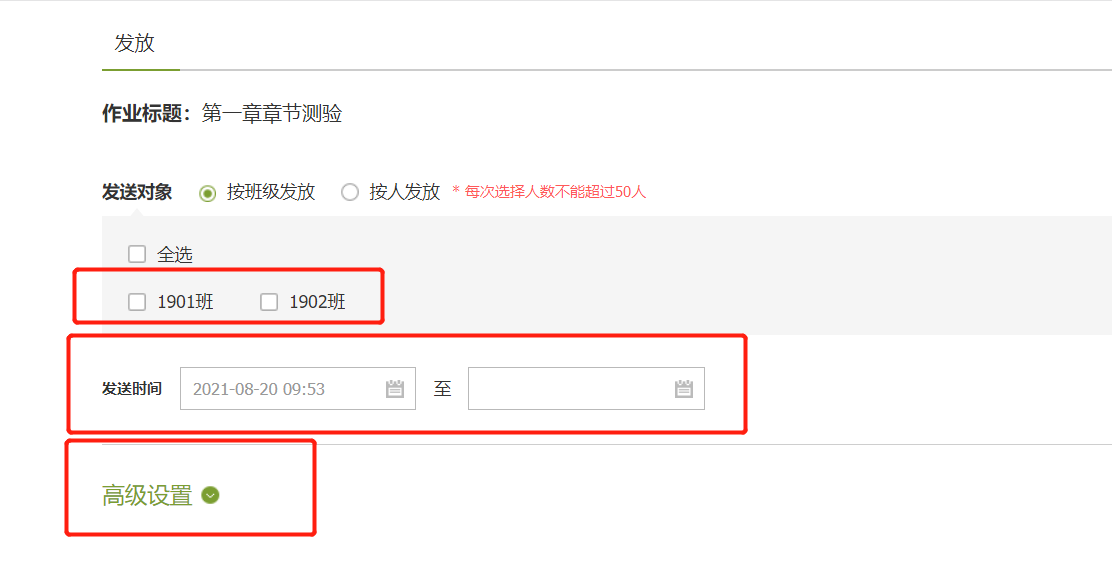 进入作业模块,创建作业,发布作业,对于已经建好作业库的老师,可从作业库中直接选择作业发布,发布时注意选择发布对象,设置好作业时间以及其他高级设置部分。