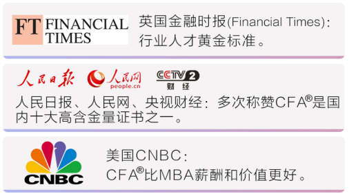 CFA全称Chartered Financial Analyst(特许金融分析师),被全球170多个国家认可,是全球投资业里最为严格与含金量最高的资格认证,被誉为“全球金融第一考”及“华尔街的入场券”,为全球投资业在道德操守、专业标准及知识体系等方面设立了规范与标准。《金融时报》(Financial Times)于2006年将CFA专业资格比喻成投资专才的“黄金标准”。2016年,国务院取消220项职业资格许可认定事项,并推崇中国考生大力参与十大高含金的资格证书考试。其中,CFA是唯一上榜的金融证书,也是唯一上榜的国际证书。