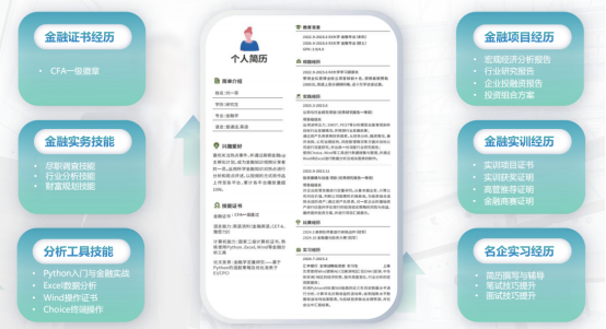 根据每位学员的不同学业和职业需求,借助科学方法理论和测评分析工具,综合评估学生能力,明确求职方向,找出现有差距、定位目标公司、规划求职路径,助力学员在求职路上脱颖而出;资深老师1v1简历辅导,将过往经历写入简历,深度挖掘履历亮点;面试技巧传授,帮助学生在面试前做好充足准备,指导学生如何在面试过程中展现自己的能力,抓住面试中的“拐点”,综合提升斩获目标offer概率,叩响金融职业大门。