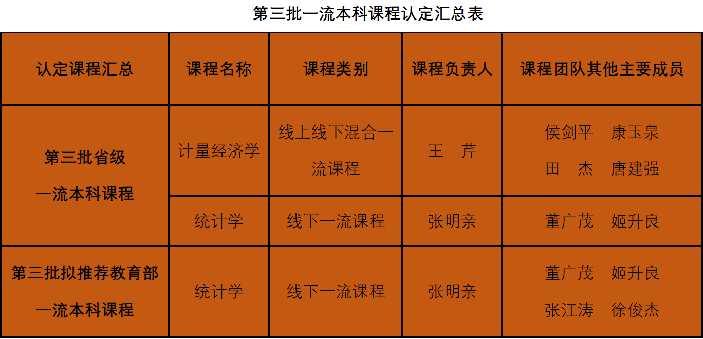 一直以来,BB贝博艾弗森官方网站紧抓课程建设主线,对标教育部要求,树立课程建设新理念,推进课程改革创新,前期申报课程组经过多次专家组认真细致的评审打磨,依据专家组给予的意见和建议进行认真修改,持续在一流本科课程建设上下功夫,提升一流课程的使用效果。通过教师们的不懈努力,贝博官网张明亲团队《统计学》(线下一流课程),王芹团队《计量经济学》(线上线下混合一流课程),获批2023年第三批认定省级一流本科课程。《统计学》课程被推荐至教育部参评国家级一流本科课程。