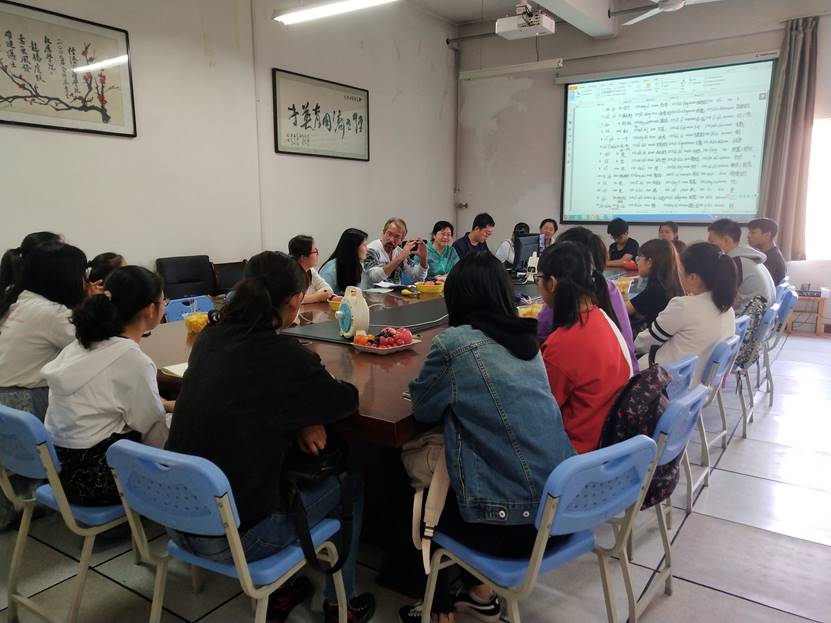 首先,苏兵老师对同学们寄语。英语作为一门技能,是以后职业发展的敲门砖,学好、学精是很有必要的,希望同学们能不断提高自己的英语水平,珍惜大学时光,提升自身综合素质。预祝同学们四六级取得满意的成绩。接下来,进入座谈交流环节。同学们就自己或者班级同学在英语学习过程中遇到的困惑、问题、方法、目标等进行自由提问,老师们一一进行认真的解答和建议。其中,外教老师Terence重点讲到,英语学习是一个不断重复的过程,就像我们学习自己的母语一样,它需要环境去适应与练习。同时,还把自己总结的600个英语单词‘学习秘籍’与大家共享。最后,尚宁华老师对座谈会进行了总结,对同学们提出了殷切的期盼。