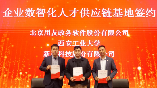 上午嘉宾们围绕数智时代一流专业建设、产教融合校企育人培养模式进行分享与交流姬浩代表学院与北京用友政务软件股份有限公司、新道科技股份有限公司进行企业数智化人才供应链基地签约