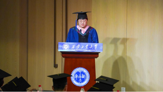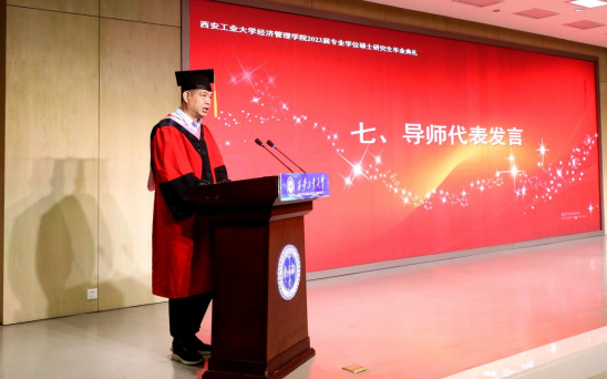 MBA专业毕业生代表葛林艳代表全体毕业生向母校、师长、家人、朋友,致以最衷心的感谢。表示将时刻铭记“西工人”所肩负的使命与责任,用自己的实际行动诠释“敦德励学,知行相长”的校训,践行“忠诚进取,精工博艺”的校风,努力成为各行各业的栋梁之才。祝愿母校,滋兰树慧,永续华张;祝愿老师们工作顺利,桃李芬芳;祝愿同学们轻装策马青云路,人生从此驭长风。