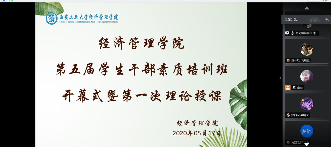 为提高学生干部综合素质,夯实干部队伍建设,2020年5月17日晚19:00,BB贝博艾弗森官方网站于线上举办第五届学生干部素质培训班开幕式暨第一次理论授课。培训班共计64名学员一同参与,BB贝博艾弗森官方网站团委书记许金鑫以及众团学组织干部参加本次开幕式。