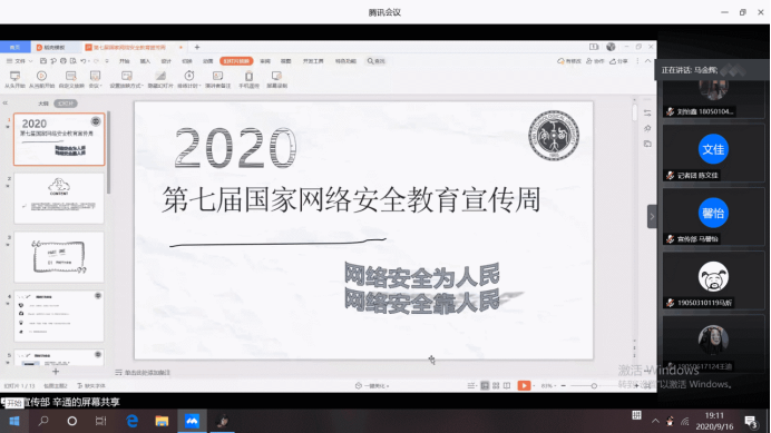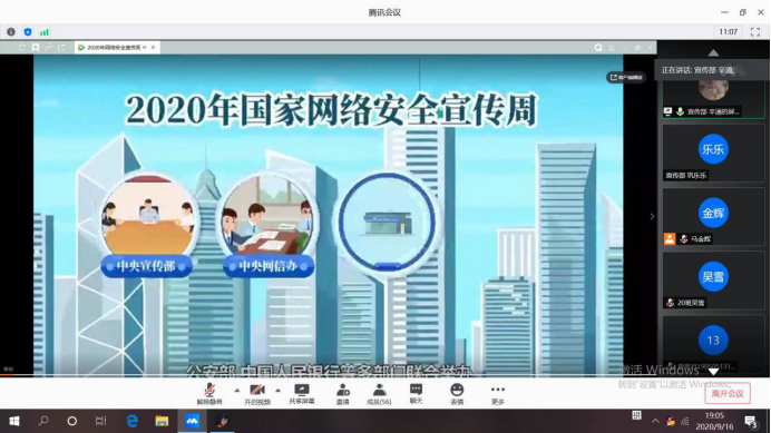 2020年9月16日下午七点,BB贝博艾弗森官方网站BB贝博艾弗森官方网站团委响应国家网络安全宣传周的号召,在腾讯会议开展了以“网络安全为人民,网络安全靠人民”主题宣传活动,以教育广大师生遵守网络安全法律法规,增强网络安全自我保护意识,共同营造健康和谐的网络空间环境。活动由团委宣传部干事辛通进行主持,BB贝博艾弗森官方网站各学生干事及各班相关宣传委员、科技委员参与了本次活动。