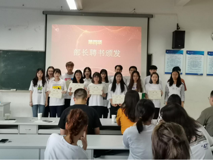 首先,BB贝博艾弗森官方网站团学组织主席代表吴凡发言,回顾两年来的工作历程,分享收获与感悟,在一定程度上鼓舞了干部们的工作热情。随后,许金鑫老师为主席团成员颁发聘书并进行合影留念。紧接着,部长代表张文宇同学进行发言,对以后的工作计划做出展望,团学组织各个部长接受主席团的聘书颁发。仪式最后,许金鑫老师进行总结发言,肯定全体学生干部的工作成果,对在场的学生干部给予殷切的希望,并激励广大学生干部不断进取、永创佳绩,成就更好的自己。