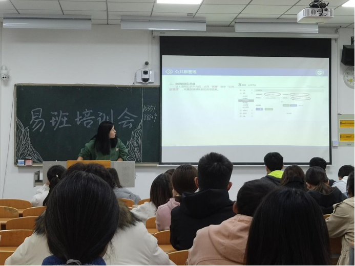 会议开始,负责人张晓玉进行了自我介绍,并强调建立完善易班体系、普及易班使用的重要性。紧接着,在易班工作的培训中,张晓玉从公共群管理、通知管理、轻应用管理和课程管理四方面展开,重点讲解了公共群的建立与通知内容的发布。学院各班易班负责人对培训各项要点进行记录和操作。