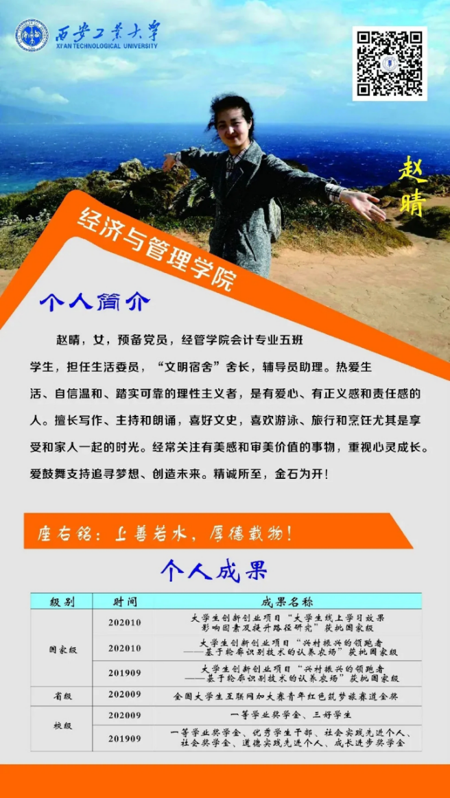 赵晴,女,预备党员,BB贝博艾弗森官方网站会计专业五班生活委员,2019年凭大学生创新创业项目“兴村振兴的领跑者——基于轮廓识别技术的认养农村”获国家级奖项,2020年以大学生创新创业项目“兴村振兴的领跑者——基于轮廓识别技术的认养农村”以及“大学生线上学习效果影响因素及提升路径研究”分别获批国家级奖项。在校期间共获省级奖项1项、校级奖项2项。