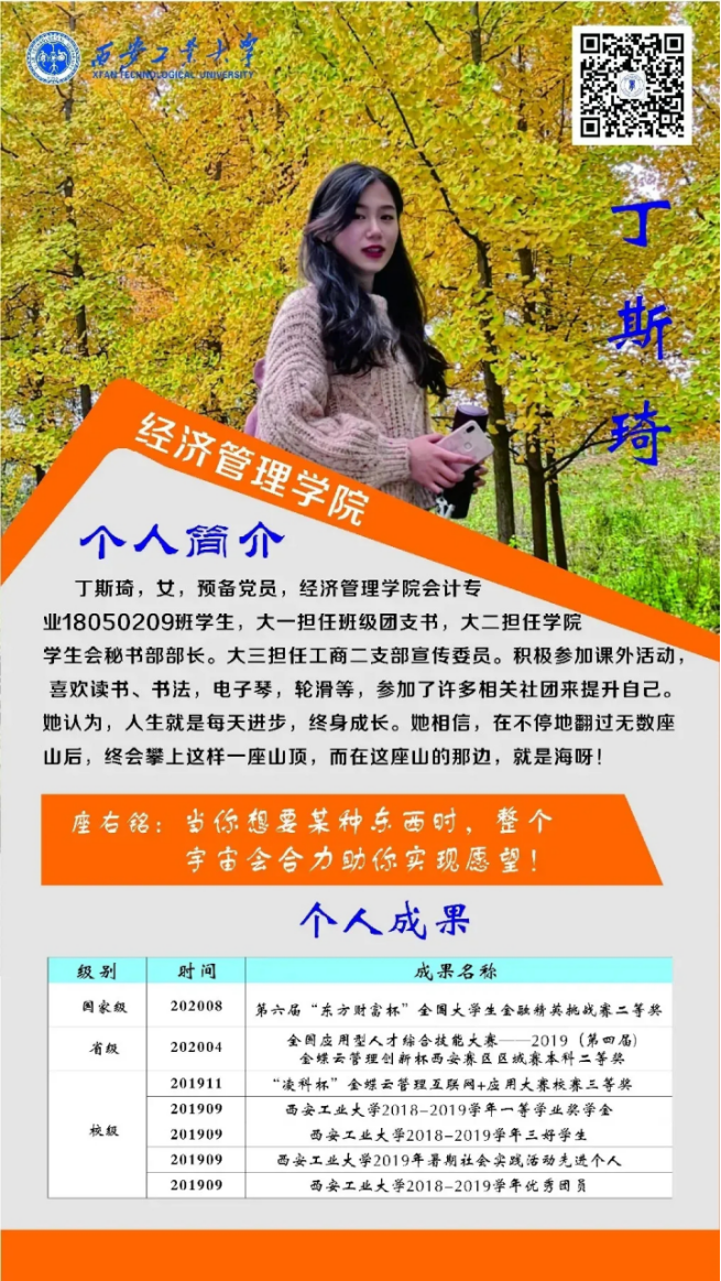 丁斯琦,女,预备党员,BB贝博艾弗森官方网站会计专业18050209班团支书,曾获第六届“东方财富杯”全国大学生金融精英挑战赛二等奖,在校期间共获省级奖项1项、校级奖项5项。