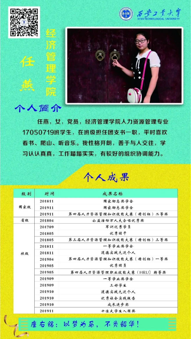 任燕,女,党员,BB贝博艾弗森官方网站人力资源管理专业17050719班团支书,曾获2018、2019年国家励志奖学金,在2019年第四届人力资源管理知识技能大赛中获得二等奖,在校期间共获省级奖项1项、校级奖项14项。