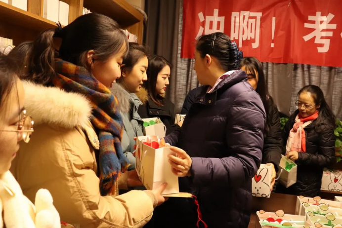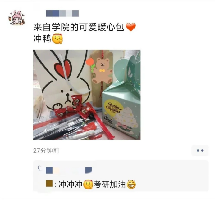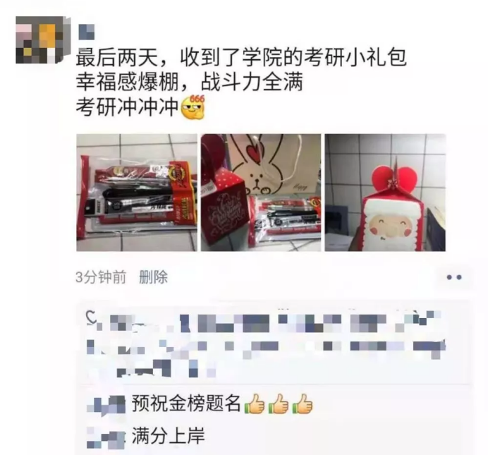 学院辅导员先后走进公寓,亲手将爱心包送到学生手中。学子们收到爱心包之后纷纷发朋友圈表示深受感动,感谢学院的关心和关爱,一定会认真备考,考出满意的成绩!