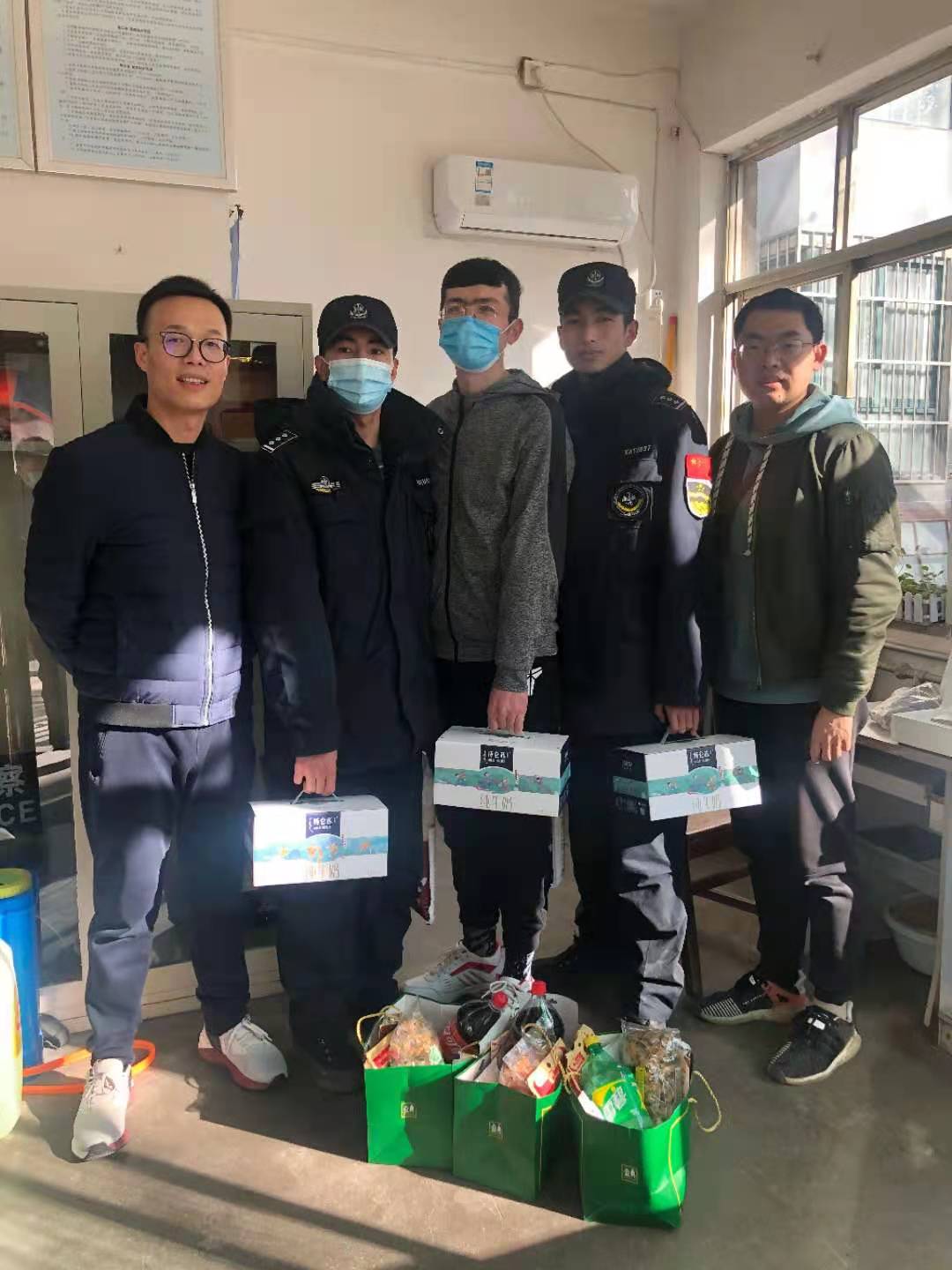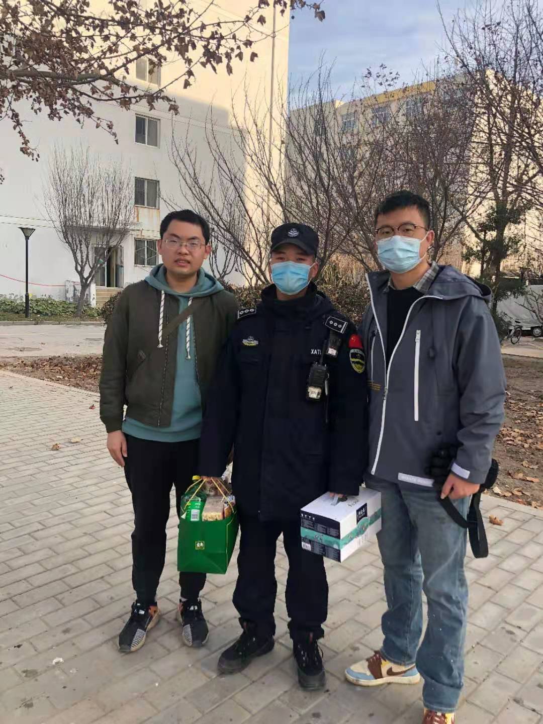 在未央校区的学生岳世祺看到学院老师们带来的新春礼物,十分感动,表示留校担任爱校卫士非常光荣,感谢学院领导和老师们的关心。岳世祺同学在部队服兵役复员后,在平凡的生活中继续发扬军人的作风,在去年疫情最严重时志愿服务所在社区,深入防疫第一线,今年作为爱校卫士队长带头放弃回家过年,坚守在学校防卫第一线,为学校安全贡献自己的一份力量。
