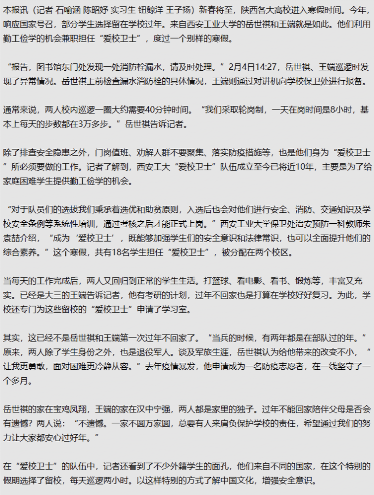 今年,为响应国家号召,学院部分学生选择以“爱校卫士”这种勤工俭学方式在校过年。既锻炼了能力,提高了爱校荣校意识,又增强了学生责任与担当意识。据悉,岳世祺等同学在疫情期间留校守护校园安全事迹被多家媒体报道。
