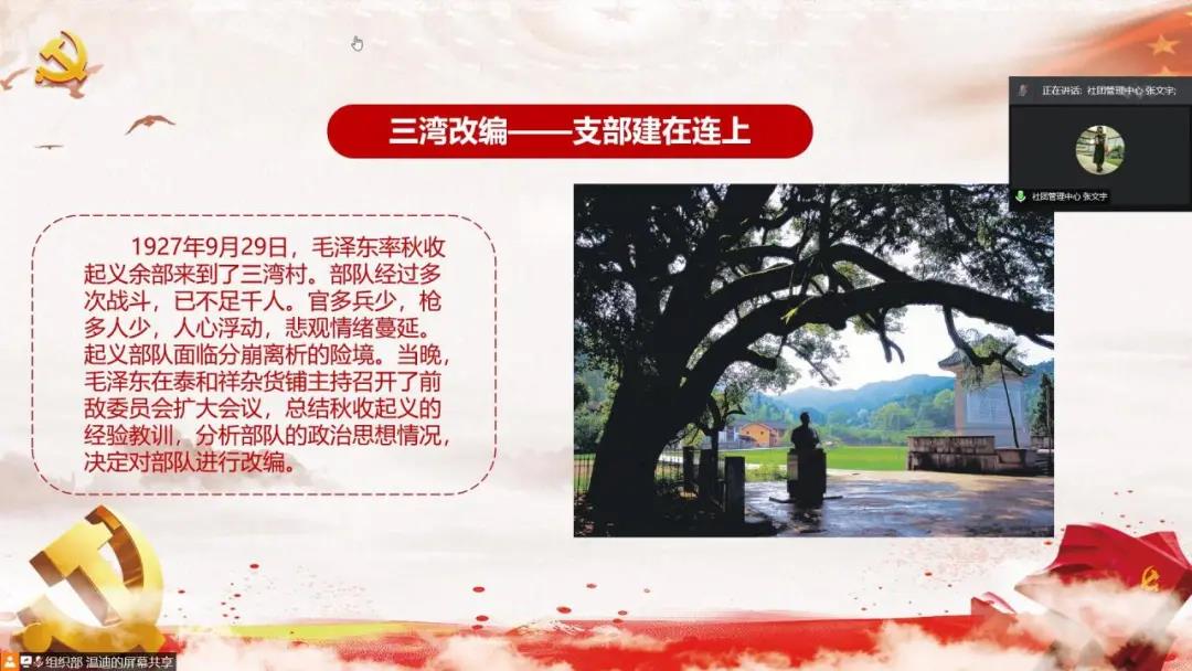 随后,张文宇、夏维婷、王珂欣依次分享了三湾改编、新中国经济奠基人陈云、抗日民族英雄杨靖宇同志的相关事迹,使参会人员更加深刻地体会到了党在百年风雨中的艰辛以及共产党人为党为人民披荆斩棘、顽强拼搏的无畏精神。