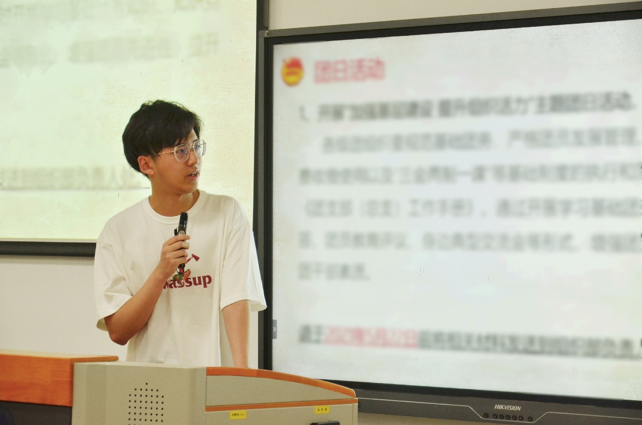首先,由组织部温迪讲述团支书主要工作职能,向团支书提出工作要求,介绍院团委近期的工作安排,关于近期团日活动的开展以及活动材料提交的相关要求、对团支部工作手册的填写说明以及特别针对于毕业年级网上智慧团建团关系转接的流程介绍和相关问题说明。