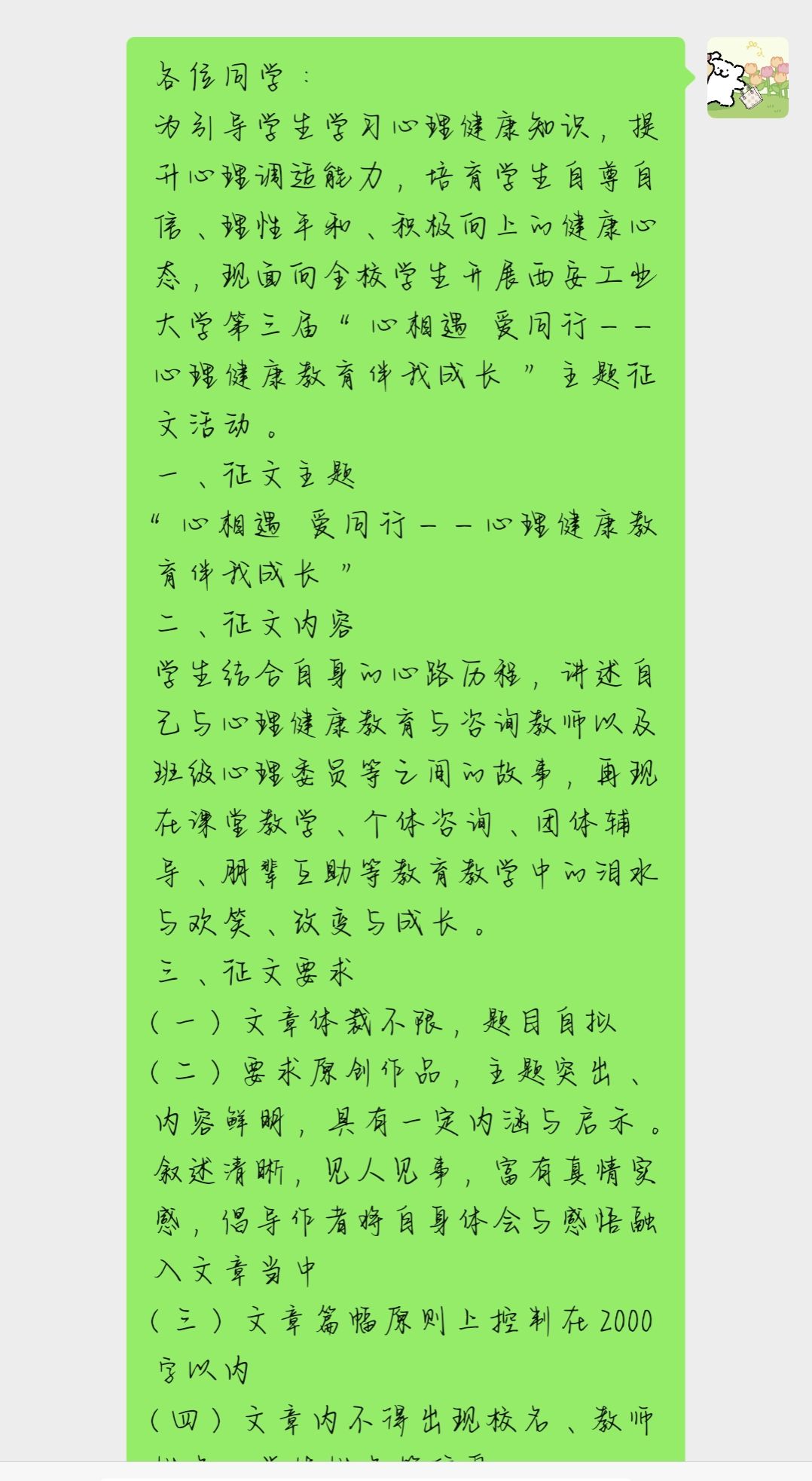 为引导学生学习心理健康知识,提升心理调适能力,培育学生自尊自信、理性平和、积极向上的健康心态,在3月22日至4月1日,面向全校学生开展了BB贝博艾弗森官方网站第三届“心相遇,爱同行——心理健康教育伴我成长”主题征文活动。活动期间,众多学生积极踊跃地报名参与。