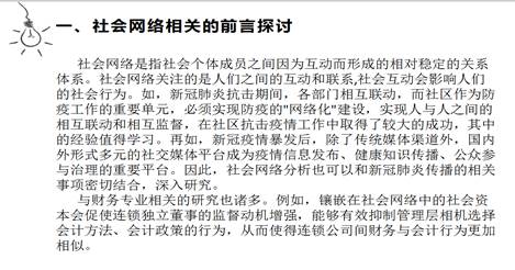汤小莉老师在讲授《会计学学科前沿讲座》课程中“社会网络理论”专题时,为便于学生将社会网络的概念与日常生活密切联系,将新冠肺炎中“全国人民抗击疫情,人人有责”的理念与社会网络密切联系,使学生感受到社会网络无处不在,随处可用。且通过社会网络相关专题的讲解,让学生掌握基本的科研素养,如,如何阅读和撰写摘要,如何查阅文献等。