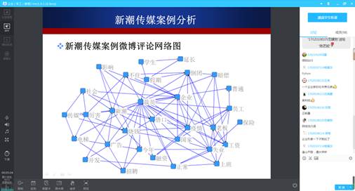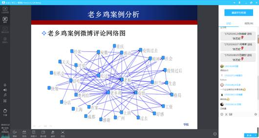 在分析“企业文化、企业价值观”时,陈老师以自己最近完成的一篇论文为例,选取新潮传媒在复工首日便裁员降薪和老乡鸡宁愿亏损5亿,卖房卖车也要让员工有班上这两个案例进行对比分析,为学生深入剖析了不同价值观的企业在困难时期选择了不同的方式对待员工,而这种不同的处理方式反过来又会影响自身的形象与发展。在分析过程中,陈老师详细展示了如何运用Netdraw可视化软件对微博评论大数据进行词频网络分析,如看到老乡鸡的网络图,有的同学马上说“词频分析出来的这个‘奥利给’确实已经成为一个网络流行语了!词频网络分析太好用了。”
