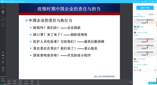 陈艺妮老师在《企业(军工)管理》课程中讲解“企业与企业组织”理论时,将教学内容与自己的国家自然基金项目中关于“企业社会责任”的研究结合起来,运用疫情期间企业捐款、捐助防疫物资、提供后勤保障、爱心助农、开发防疫小程序等案例,让学生就企业如何承担社会责任展开讨论。